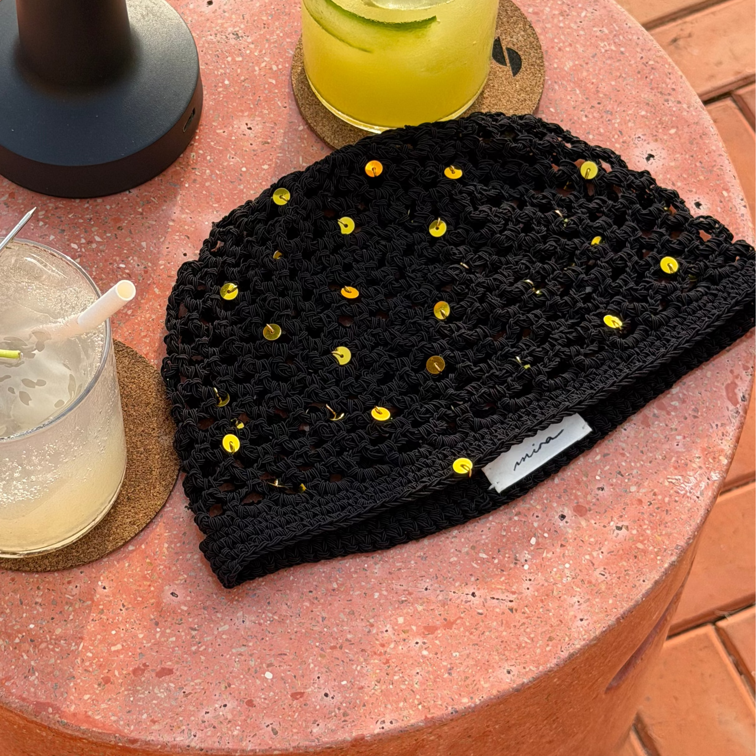 Handmade black beanies in limited editions, adorned with gold or silver sequins.
